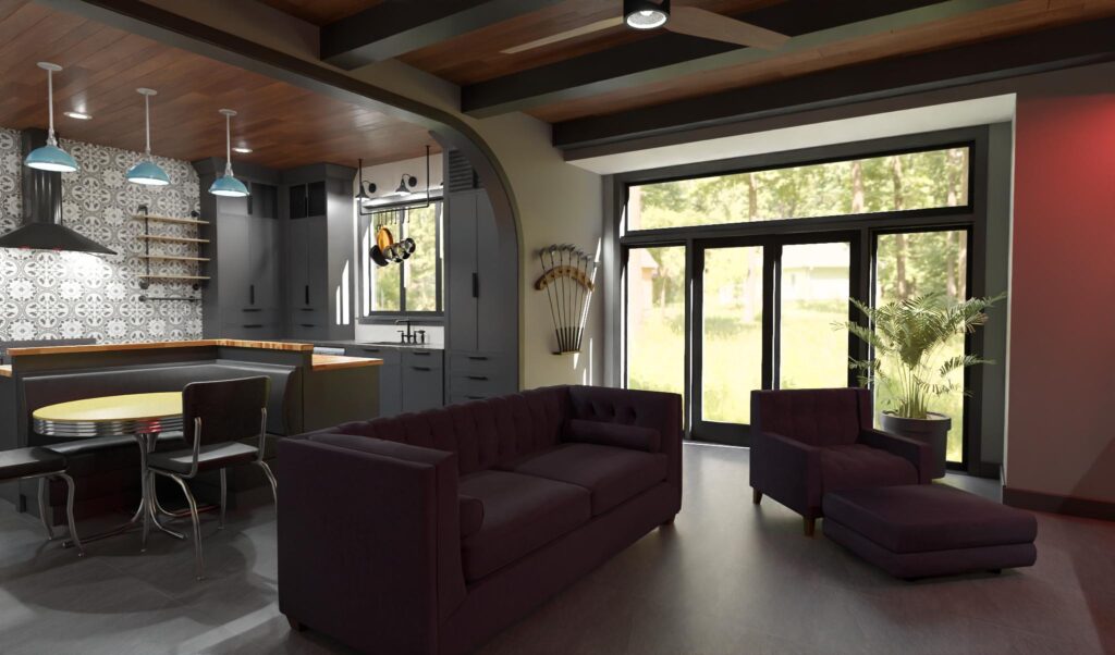 These renderings captures a bold interplay of style and practicality, where sleek industrial elements meet playful retro accents. The space is designed to feel lived-in yet curated, blending comfort with modern edge.
